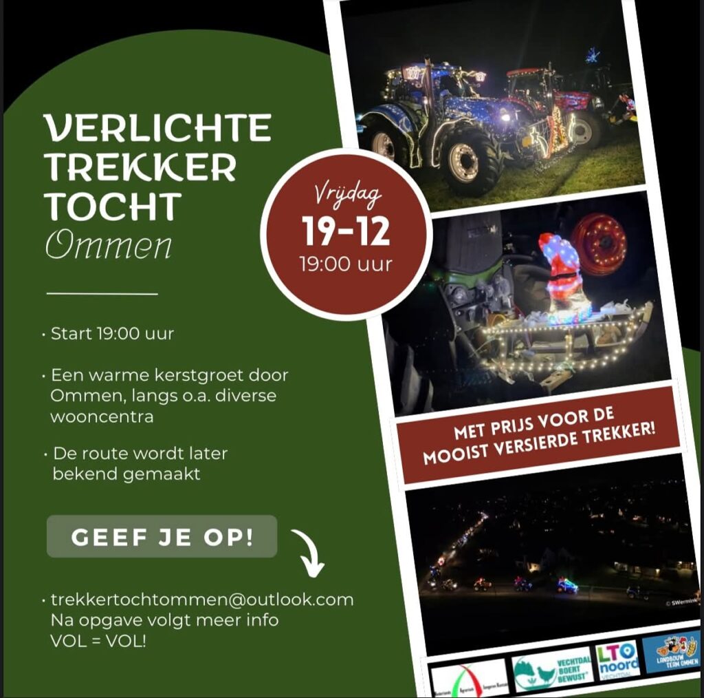 Deze verlichte trekkertocht wordt gehouden op vrijdag 19 december 2025. De trekkers starten om 19.00 uur. Opgeven is niet meer mogelijk. We zitten vol.
